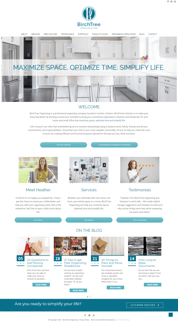 Birchtree Organizing is a new company based out of London, Ontario. The client requested a clean website with the ability to showcase portfolio items with the ability to sort projects based on what was done. In addition to a portfolio, the client also requested the ability to add testimonials, PDF resources and blog pages. This website was also integrated with Mailerlite to capture subscribers to the mailing list. To view the full website please visit: birchtreeorganizing.ca